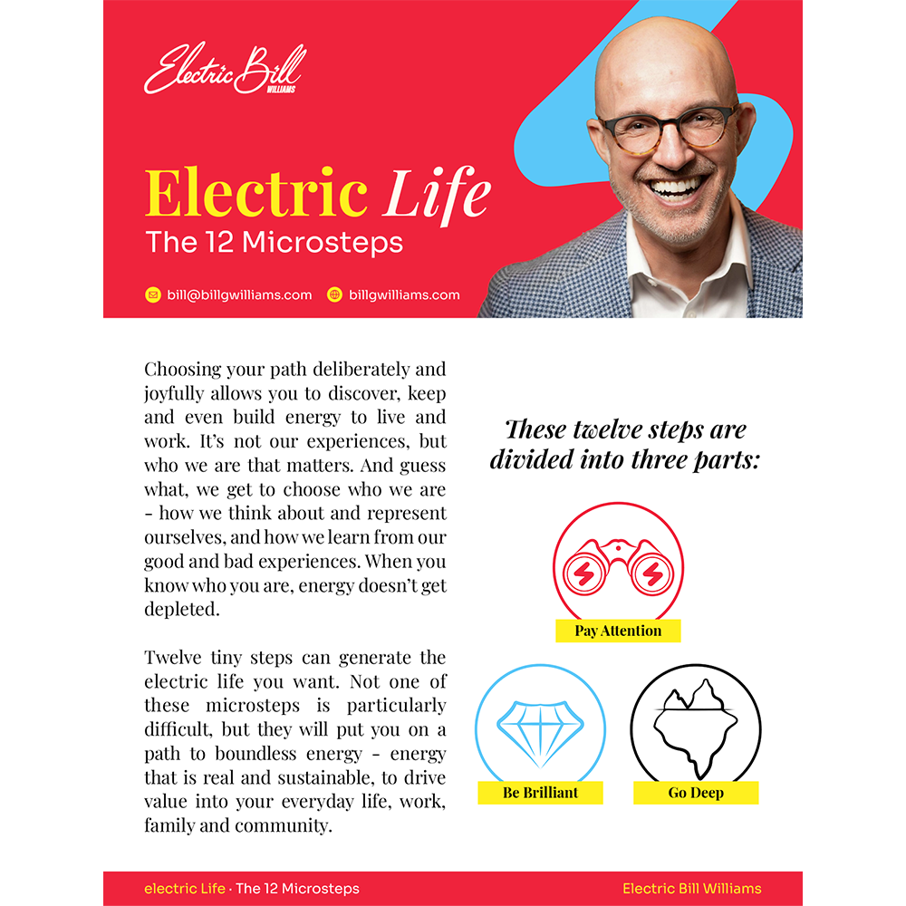 Electric Bill will share 5 of his Microsteps from Electric LIFE! 12 Microsteps to Pay Attention, Be Brilliant and Go Deep!Bill shares how you, too, can tap into a well of endless energy that draws out the value in your everyday life, work, family, and community. Blending engaging personal stories and case studies with research-backed insights, tips, and easy-to-implement steps, Bill gives you the skills to leave work every day with more energy than you arrived with.